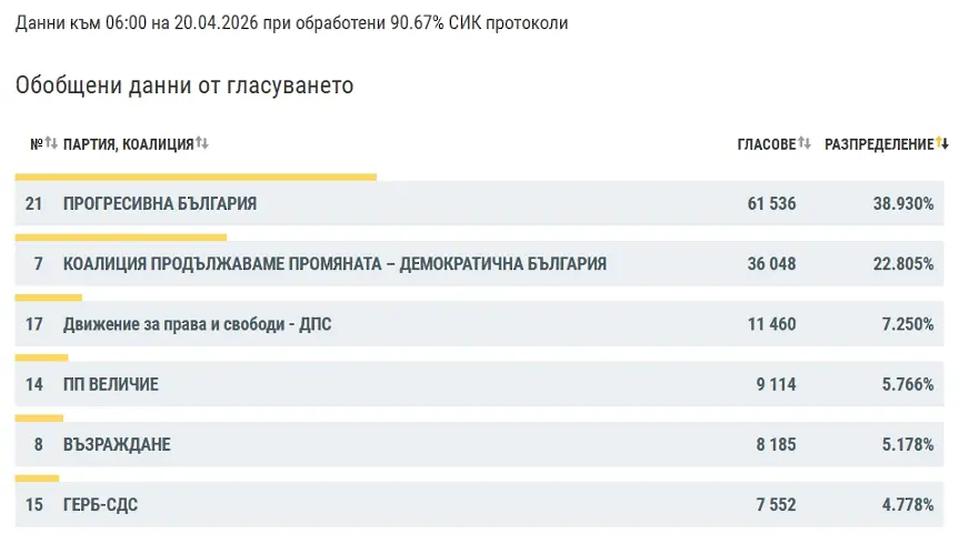 Ето какво сочат данните на ЦИК към 06:00 на 20.04.2026 при обработени 90.67% СИК протоколи.