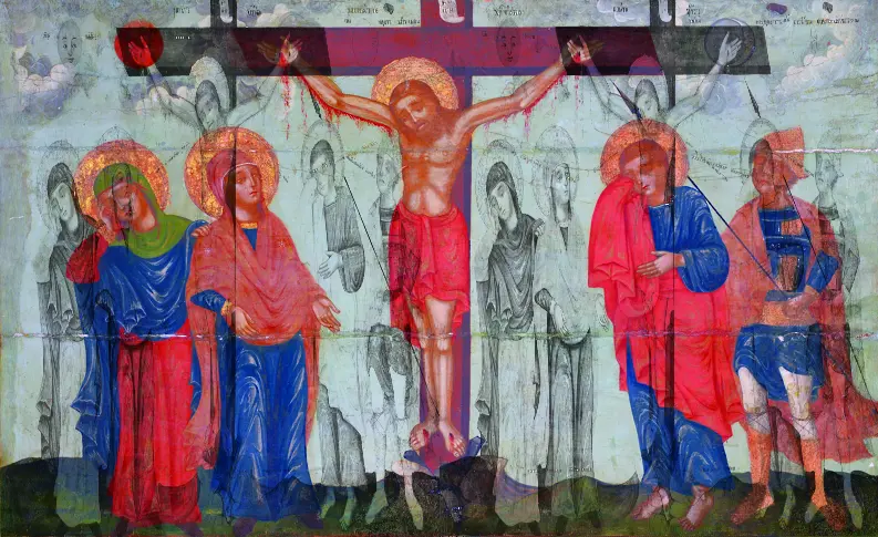 Въображаемият простор е пресъздаден чрез синьо-резидавия фон на иконата. В него от земята до небето се извисява кръстът с разпнатия на него Христос - като мост, съединяващ земното и небесното царство. Красотата на образа не е загубена, по тялото му няма следи от физически мъчения, само скръбта в израза и движенията на заобикалящите го пресъздават мига.