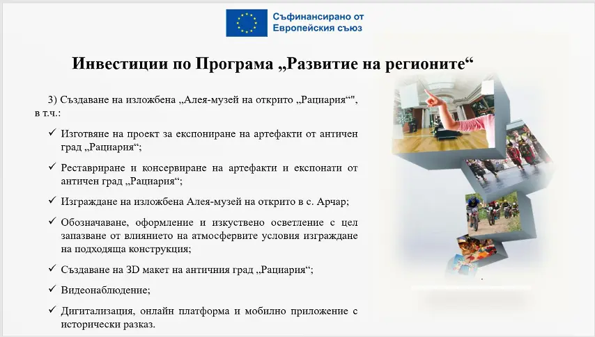 Изграждане на изложбена Алея-музей на открито в с. Арчар; Реставриране и консервиране на музейни експонати от античен град Рациария; Създаване на 3D макет на античен град Рациария; Онлайн платформа и мобилно приложение с исторически разказ за античен град Рациария.