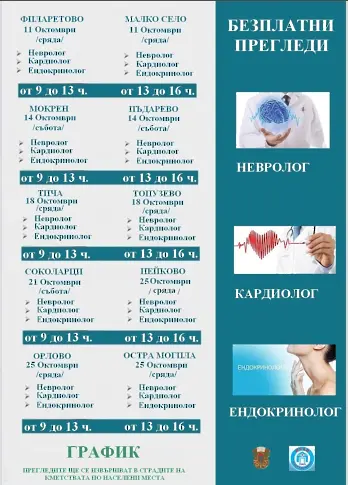 2. с. Малко село – 11 октомври /сряда/, от 13 до 16 часа – невролог, кардиолог, ендокринолог