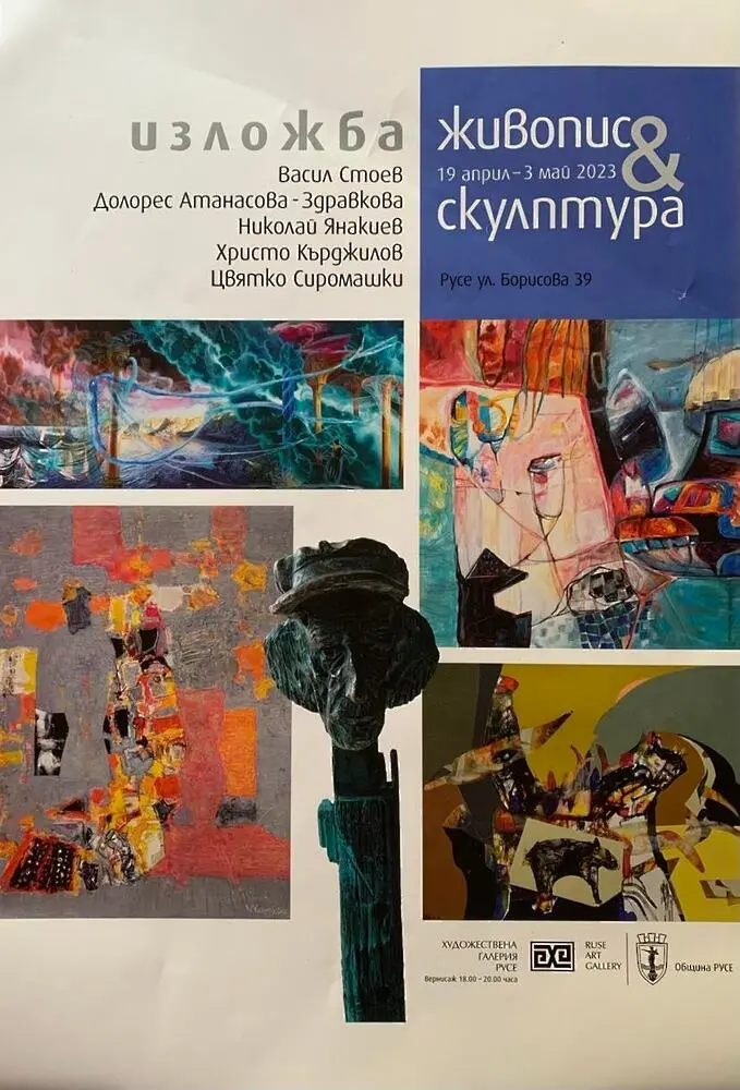 На 19 април (сряда), от 18.00 ч. ще бъде открита изложба „Живопис и Скулптура“ на авторите Васил Стоев, Николай Янакиев, Христо Кърджилов, Долорес Атанасова – Здравкова и Цвятко Сиромашки. Куратор на експозицията е Радослав Гиновски. Ще бъдат представени 50 творби, изпълнени с акрил и масло върху платно и картон, както и в различни смесени техники. Посетителите ще могат да видят и десет скулптури от метал и дърво. Целта на изложбата е за първи път русенските ценители да се срещнат с произведенията на известните български творци.