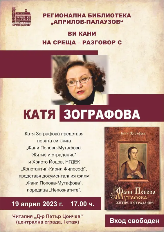 На 19 април от 17.00 ч. в Читалня „Д-р Петър Цончев“ на РБ „Априлов-Палаузов“ писателката Катя Зографова ще представи 19-тата си книга "Фани Попова-Мутафова – житие и страдание".
