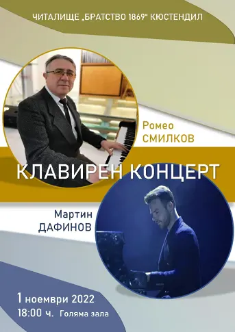 Днес от 18:00 ч. в Голямата зала на читалище „Братство 1869“ гр. Кюстендил ще се проведе Клавирен концерт на Ромео Смилков и Мартин Дафинов – пиано. В програмата ще прозвучат произведения от Й. С. Бах, Ф. Лист, Шуман и С. Рахманинов.
