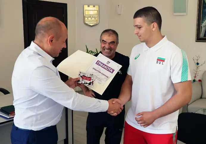 Радостин Василев, бронзов медалист от европейското първенство по борба за кадети, проведено миналия месец в Сърбия, прие днес кметът Страцимир Петков. Той го награди за високите спортни постижения и за издигане престижа на Ловеч, като му пожела спортно дълголетие и много нови успехи.