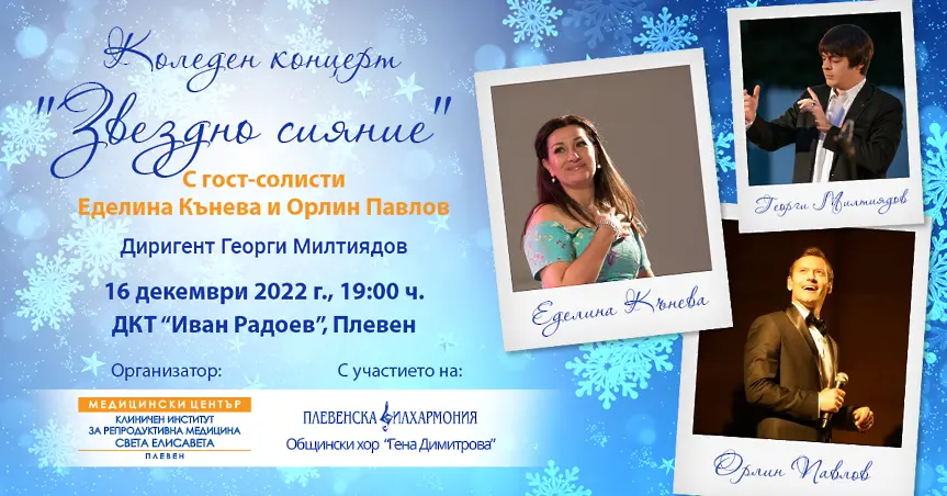 За 15-та поредна година Медицински център – Клиничен институт за репродуктивна медицина „Св. Елисавета“ – Плевен с управител доц. д-р Емилияна Конова подарява на плевенчани музикален празник в навечерието на Рождество Христово. В коледния концерт „Звездно сияние“ ще участват Плевенската филхармония и Общински хор „Гена Димитрова” с диригент Анелия Дечева.