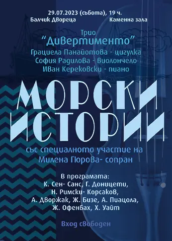 В Каменна зала на „Двореца“-Балчик, на 29 юли, от 19.00 часа ще оживеят „Морски истории“. Вълнуващият концерт-спектакъл ще бъде представен от трио „Дивертименто“ - Грациела Панайотова (цигулка), София Радилова (виолончело), Иван Керековски (пиано), и певицата Милена Гюрова, които ще преведат публиката през бурни и спокойни води, приключения в открито море и мечти по нови брегове, с произведения от К. Сен- Санс, Г. Доницети, Н. Римски- Корсаков, А. Дворжак, Ж. Бизе, А. Пиацола, Ж. Офенбах, Х. Уайт.