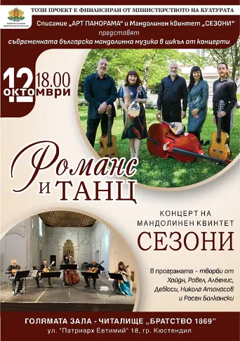 На 12 октомври 2022 г. от 18:00 ч. в Голямата зала на читалище „Братство 1869“ гр. Кюстендил ще се проведе Концерт "РОМАНС И ТАНЦ" на Мандолинен квинтет "СЕЗОНИ". В програмата - творби от композитора Росен Балкански и аранжименти на западно-европейски и български произведения от Росен Балкански и Пламен Маслев.
