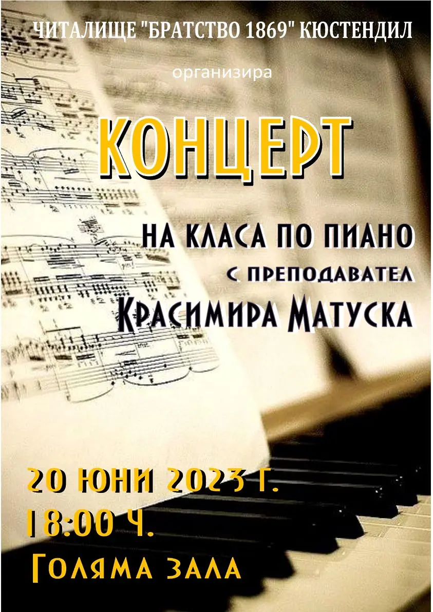 На 20 юни 2023 г. от 18:00 ч. в Голямата зала на читалище „Братство 1869” ще се проведе концерт на възпитаниците от класа по пиано към Детската музикална школа на читалището с преподавател Красимира Матуска.