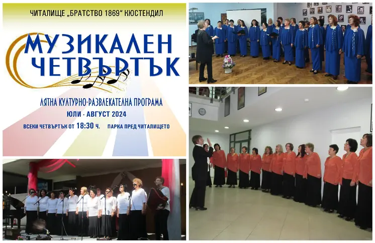 На 29.08.2024 г. от 18:30 ч. в парка пред читалище „Братство 1869” гр. Кюстендил ще се проведе концерт на Вокална формация „Неразделни” с ръководител Веселка Петрова. Инициативата е част от лятната културно-развлекателна програма на читалището - „Музикален четвъртък”.