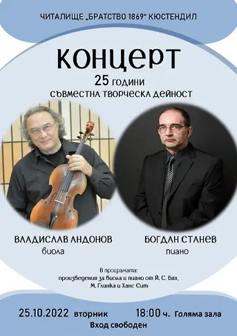 На 25 октомври 2023 г. от 18:00 ч. в Голямата зала на читалище „Братство 1869“ гр. Кюстендил ще се проведе Концерт „25 години съвместна творческа дейност“ на ВЛАДИСЛАВ АНДОНОВ – виола и БОГДАН СТАНЕВ – пиано.