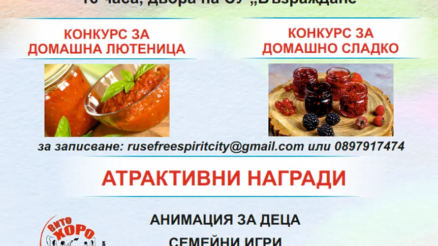 В два кулинарни конкурса с атрактивни награди ще могат да се включат русенци по време на „Празник на квартала - Заедно във Възраждане“, който ще се проведе на 12 октомври /събота/ от 16 ч. в двора на СУ „Възраждане“. Желаещите ще могат да премерят възможностите си в приготвянето на домашни сладка и лютеница. Събитието се организира от Общинска фондация „Русе – град на свободния дух“ с финансовата подкрепа на „Холеман България“ и „Тива Плюс“.