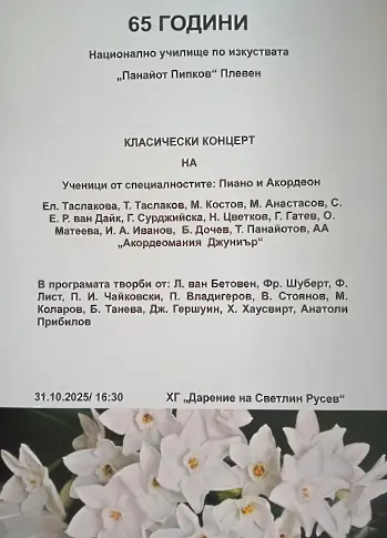 31 октомври (петък) - Класически концерт по повод 65 години от основаването на НУИ „Панайот Пипков“ – Плевен. Начало - 16.30 часа;