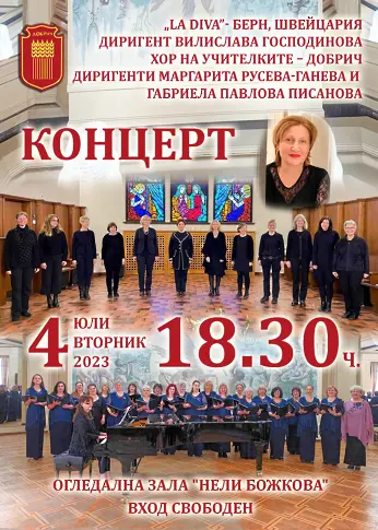 На 4 юли, вторник, от 18.30 часа, в Огледална зала „Нели Божкова“ ще се състои съвместен концерт на Хор на учителките – Добрич, с диригенти Маргарита Русева-Ганева и Габриела Павлова Писанова, и женски камерен хор „LA DIVA” от Берн, Швейцария, с диригент родената в Добрич Вилислава Господинова. Тя е основател и диригент на този хор, а професионалното й развитие в Швейцария е свързано с операта. Великолепен сопран, Вилислава Господинова повече от 25 години завладява сцената като хорист и солист на операта в Берн. Признание за таланта си получава и от българската общност – редовно е канена да участва в традиционните коледни концерти, както и в други значими културни събития организирани от посолството на Република България в Швейцария.