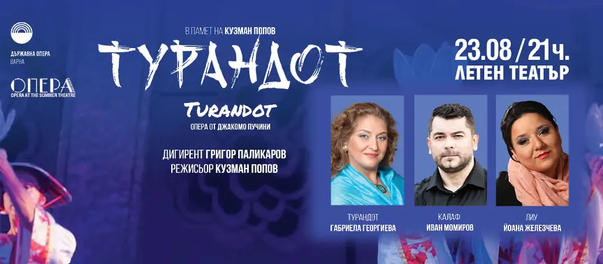 Тази много варненска постановка е сред емблематичните прочити на дългогодишния главен режисьор на Варненска опера, забележителния Кузман Попов. В творческата му биография влизат над сто реализирани оперни произведения и два пъти е удостоен с Награда Варна. С „Турандот“ оперният театър отдава почит на паметта му. Сценичният свят, създаден от режисьора, пренася зрителите в един приказен Китай с пищните цветни костюми и наситената с източна символика сценографияна Нела Стоянова.