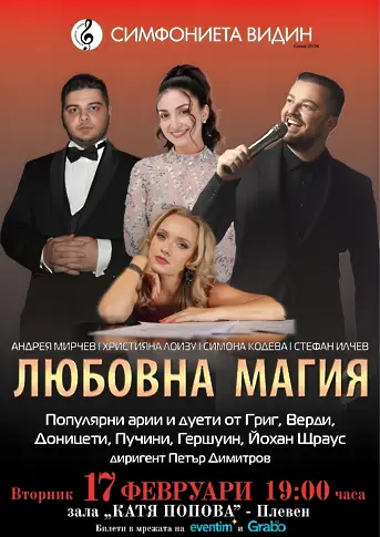На 17 февруари, вторник, от 19:00 часа, зала „Катя Попова“ в Плевен ще се превърне в сцена на изключително музикално преживяване – концертът „Любовна магия“, организиран от Симфониета Видин. Събитието обещава вечер, изпълнена с емоция, изящество и класическа красота, под диригентската палка на маестро Петър Димитров.