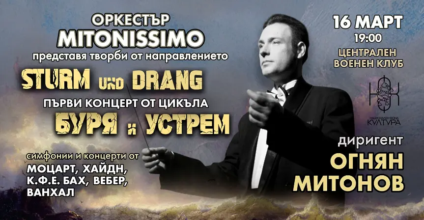 Маестро Огнян Митонов заедно с Оркестър Митонисимо ще представят 5 концерта в София, Самоков, Ловеч и Дупница с музика от интересния и малко познат свят на впечатляващи творби, вдъхновени от стилистиката на STURM und DRANG – направление в изкуството, контрастиращо на рационализма на Класицизма. То е предвестник на Романтизма с идеите си за емоционална свобода, индивидуалност, изразяване на силата на чувствата. В музиката, БУРЯ и УСТРЕМ е повлияло създаването на отделни „специални“ творби на едни от най-ярките композитори от класическия период.