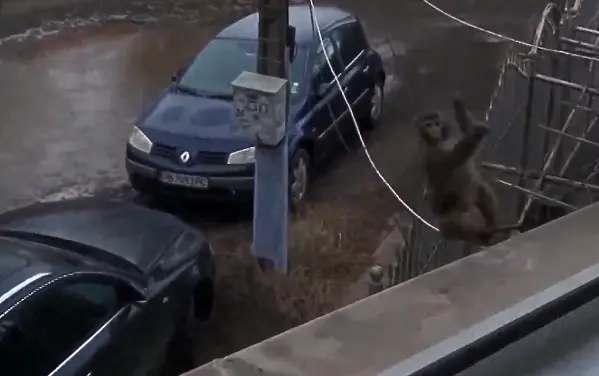 На кадрите се вижда как животното преминава през прозореца на жена, а след това се хваща за кабели. Не е ясно на кого принадлежи маймуната и как е попаднала навън, пише Bgonair.