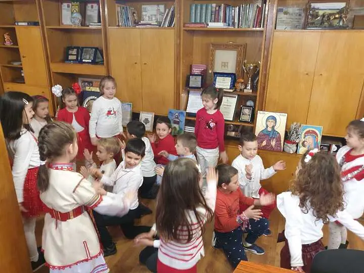 Облечени в традиционните червено-бели премени, децата на учителката Диана Галева зарадваха кмета и администрацията със собственоръчно направени картички.