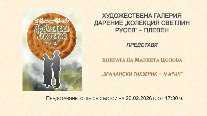 Мариета Цолова ще представи в Плевен второто преработено издание на книгата си „Врачански тиквеник - Марин“. Книгата излиза през 2017 година и предизвиква голям интерес, а тиражът е изкупен за една година. Миналата 2025-а авторката преиздава творбата, но с нови моменти и герои.