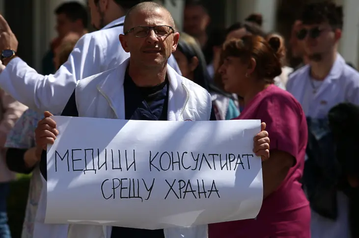 "Болница - 1000 лв., супермаркет - 2000 лв.", "Медици консултират срещу храна" - гласят част от лозунгите, които издигнаха специалистите в бели престилки пред централния вход на столичната болница.