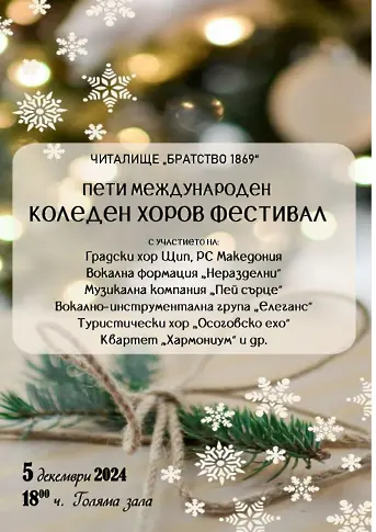 От 18:00 часа в Голямата зала на читалището ще стартира за пета поредна година Международния коледен хоров фестивал. Участие ще вземат Градски хор – Щип, Р. С. Македония, Туристически хор „Осоговско ехо”, Вокална формация „Неразделни”, Смесен хор „Братство”, Музикална компания „Пей сърце”, Вокално-инструментална група „Елеганс”, Квартет „Хармониум“ и др. Фестивалът е посветен на коледните и новогодишни празници.