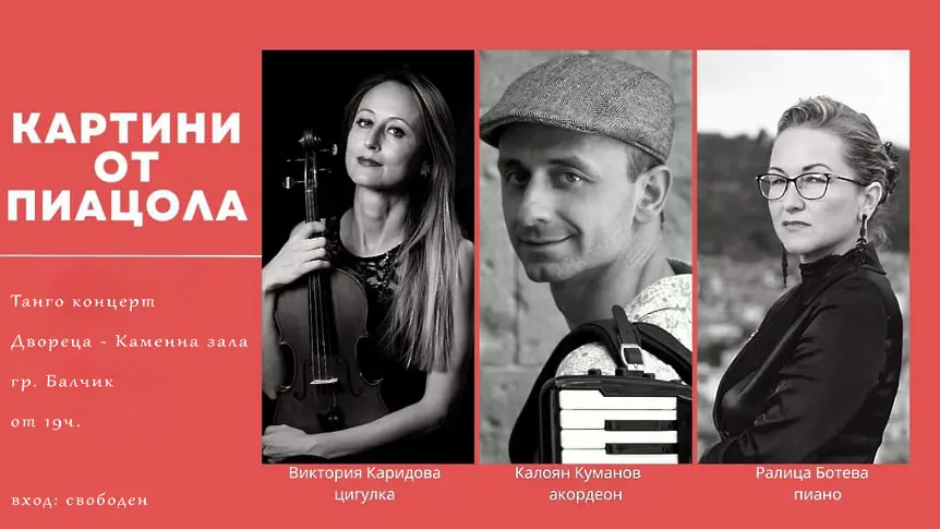 На 26 юли, от 19.00 часа, в Каменна зала – Балчик, музикалният проект „КАРТИНИ ОТ ПИАЦОЛА“ ще потопи публиката в страстния свят на тангото с музиката на Астор Пиацола. От богатия репертоар на композитора ще бъдат изпълнени едни от най-известните му изпълнения, като Adios Nonino, Libertango, Oblivion, Violentango и др.