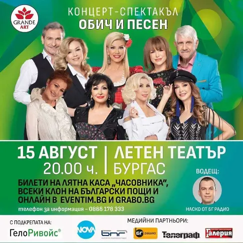 Финалния концерт за лятото от националното турне "Обич и песен" ще гастролира в Бургас навръх Богородица - 15 август. Редица обичани певици ще зарадват почитателите си както със златните си хитове, така и с нови песни. Публиката ще има удоволствието да се наслади на изпълнения на Йорданка Христова, Силвия Кацарова, Мая Нешкова, Мими Иванова, Роси Кирилова и Нелина. Към тях се присъединяват и дует ШИК, чийто мъжки глас - Краси Гюлмезов, е родом именно от Бургас.