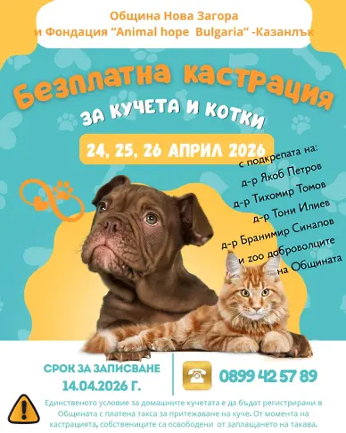 Община Нова Загора, съвместно с Фондация „Animal Hope Bulgaria“ – Казанлък, организира тридневна акция за безплатна кастрация на домашни любимци. Инициативата има за цел да насърчи отговорното отглеждане на животни и трайното намаляване на броя на безстопанствените кучета и котки в нашия град.