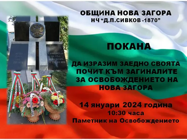 "Наближава паметният за нашия град 14 януари – денят, в който Нова Загора е посрещнала Свободата. За всички нас тя е свещена, а цената ѝ е извоювана от хилядите войни, пожертвали се за нея. Да сведем глави пред тяхната памет, да си припомним подвига им и да се преклоним пред величието на българския дух", се посочва в съобщението.