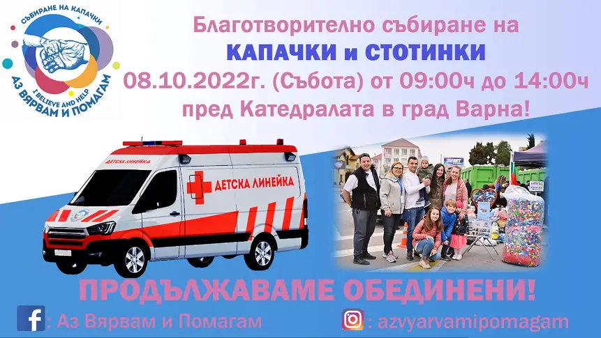 Мащабната кампания "Аз вярвам и помагам" ще проведе днес, 8 октомври, поредното си събитие. Пластмасови капачки и стотинки ще се събират отново пред Катедралата, за времето от 9.00 до 14. 00 часа.