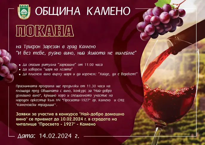 В честването на Трифон Зарезан ще вземат участие Народен оркестър към НЧ „Просвета-1927“ и СНЦ „Каменовски традиции“.
