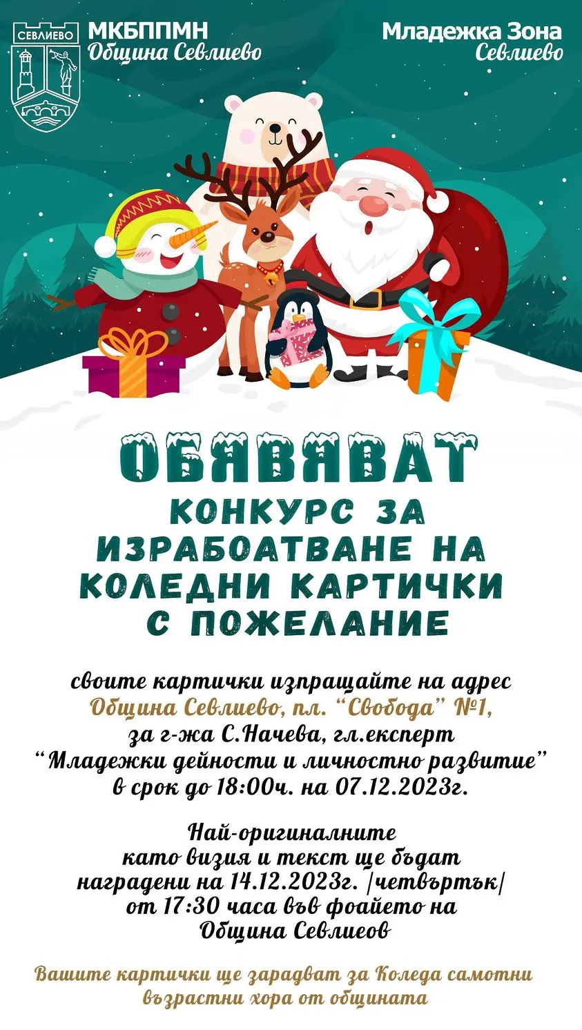 Конкурсът е насочен към всички деца и младежи на територията на общината и има за цел да провокира желание у подрастващите да изработят коледна картичка, която да бъде изпратена на самотен човек от община Севлиево. Участниците в конкурса ще бъдат ангажирани в дейност, която ги насочва към положителен модел на поведение и разбиране на другия. Дейността цели и превенция на асоциалното поведение на малолетните и непълнолетните.