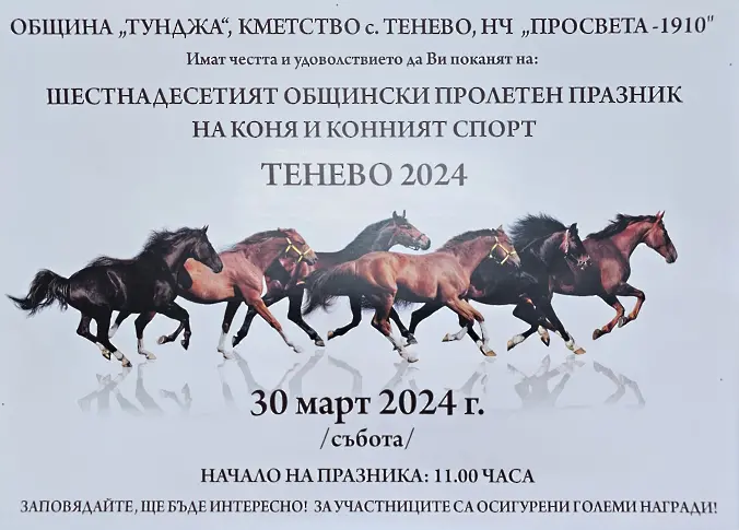 На 30 март 2024 г., от 11.00 часа, на герена в село Тенево ще се проведе Общинския пролетен празник на коня и конния спорт.