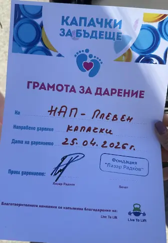 Служителите от офиса на НАП в Плевен отново подкрепиха благотворителната кампания „Капачки за бъдеще“ за закупуване на поредната детска линейка.