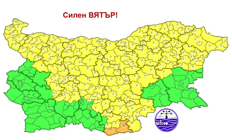 Жълт код за потенциално опасно време и силен вятър е в сила за почти цялата страна, с изключение на областите Бургас, Ямбол, Смолян, Пазарджик, Благоевград, София област, София град, Перник и Кюстендил.