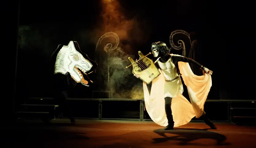 „Орфей” е спектакъл-паноптикум, съставен от монументални визуално-пластични картини, спектакъл-мозайка, съчетаващ театър на движението, игра с маски, кукли и театрални знаци. Митът за Орфей и Евридика пресъздава темата за раздялата и смъртта, за силата и слабостта на човешката душа. Постановката внушава, че макар да е божествено създание, човекът е само една искрица светлина сред необятното звездно небе.