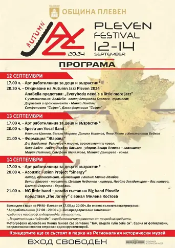 От 12 до 14 септември в Плевен ще се проведе осмото издание на организирания от Община Плевен традиционен Есенен джаз фестивал, който предлага музика на световно ниво. Началото на музикалния форум е на 12 септември (четвъртък), място на концертите - парка на Регионалния исторически музей. Входът е свободен!