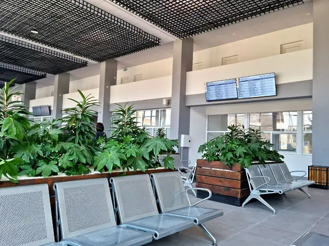 Съществуващата лепена каменна облицовка на сградата е премахната и е заменена с минерална цветна мазилка с влачена структура след полагане на топлоизолационен пакет от EPS с дебелина 10 см. Цялостно е променено разпределението на пътническия салон. Основният достъп до сградата се осъществява с въртяща се врата с обособени от двете й страни евакуационни изходи. Подменени са дограмите, реновирана е системата за отопление с подмяна на тръбната мрежа и старите амортизирани отоплителни тела. Изпълнени са климатизиране на сградата, както и нова осветителна инсталация с LED осветители. Изцяло са преустроени водопроводната и канализационна инсталации. Положена е нова настилката в основния салон, където са обособени 80 седящи места. В непосредствена близост до вход/изход към дворното пространство е изпълнено гише за градска мобилност, което ще обслужва посетителите. Обособени са багажно отделение и пет гишета за продажба на билети. Санитарни помещения са предвидени за посетителите, персонала и за хората с увреждания, за които е монтирана платформа пред главния вход, за тях са отделени и паркоместа.