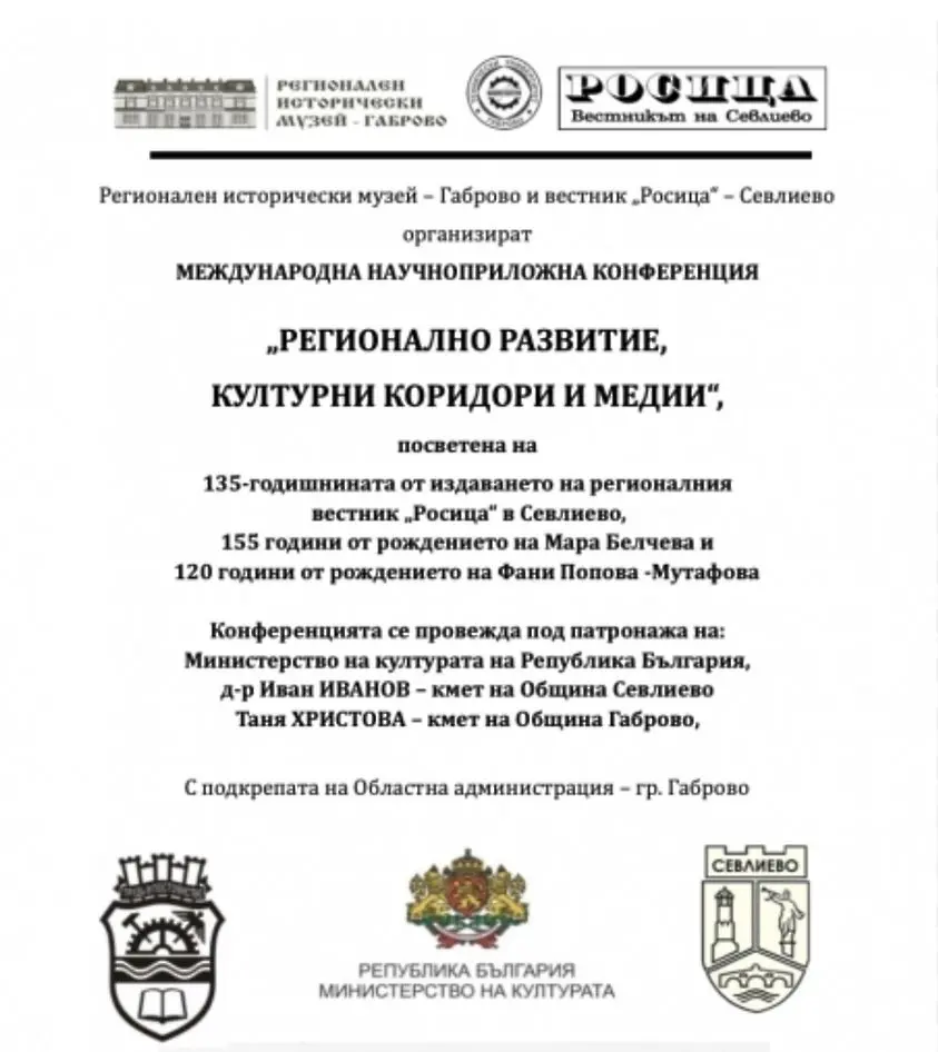 Международната научно-приложна конференция „Регионално развитие, културни коридори и медии“ е посветена на 135-годишнината от издаването на един от най-старите регионални вестници в България – вестник „Росица“ – Севлиево, 155-годишнината от рождението на Мара Белчева и 120 години от рождението на Фани Попова-Мутафова.