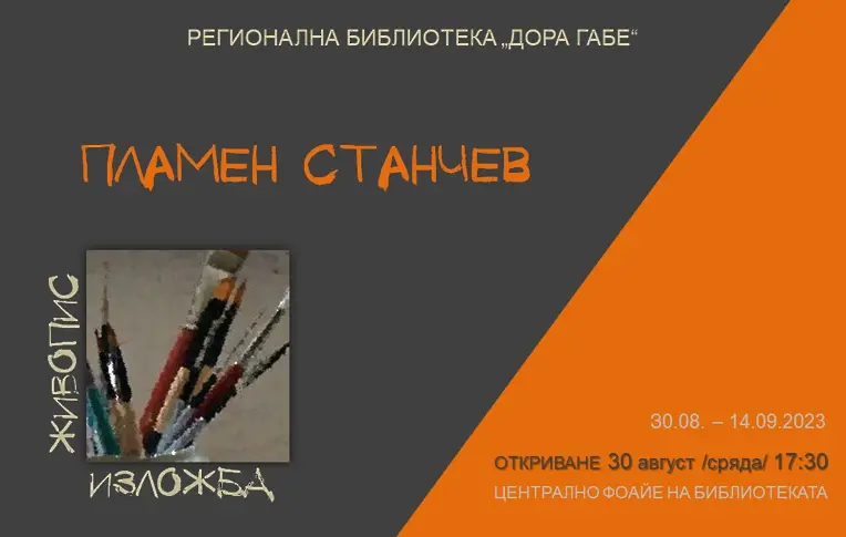 На 30 август 2023 г., от 17.30 ч, в Регионална библиотека „Дора Габе“ ще бъде открита изложба-живопис на Пламен Станчев, любител художник от Добрич.