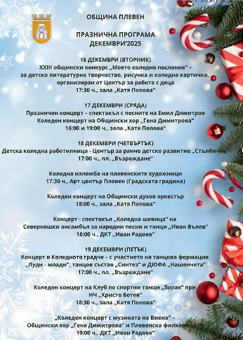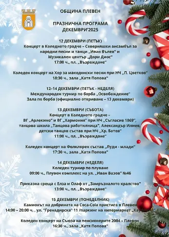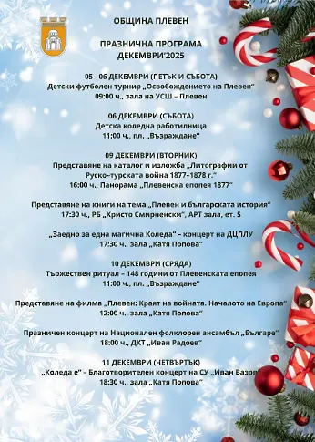Община Плевен е подготвила празничен афиш със забавления за малки и големи и кани всички жители и гости на града да споделят празничната атмосфера в най-светлия месец от годината.
