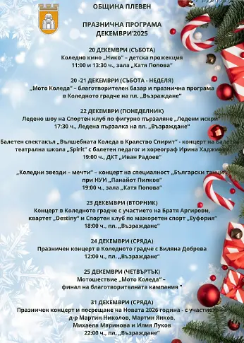 Близо 50 събития - коледни спектакли, концерти, гостуване на Национален фолклорен ансамбъл „Българе“, ледено шоу с професионални фигуристи, празнични работилници за деца, тематични изложби и много други арт събития, са част от празничната програма на Плевен за предстоящия месец декември. В центъра на града отварят врати Коледното градче и ледена пързалка.
