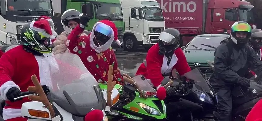 Точно в 10:00 часа една от бензиностанциите на Кукленско шосе се изпълни с десетки мотористи - преоблечени като Дядо Коледа, а дамите - като Снежанка. Те тръгнаха на традиционното си шествие из града.