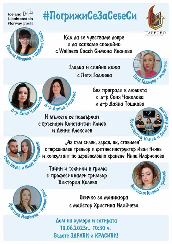 "Погрижи се за себе си" е името на събитието, на което Младежкият център в Габрово кани девойки и младежи в събота, 10 юни,от 10.30 до 17.30 часа. Мястото е Домът на хумора и сатирата, а самото събитие е посветено на здравето и красотата. Младите хора ще могат да се срещнат с лектори, които се грижат за вътрешната и външна красота, да чуят съветите им, да зададат въпросите си и дори да получат персонална помощ.
