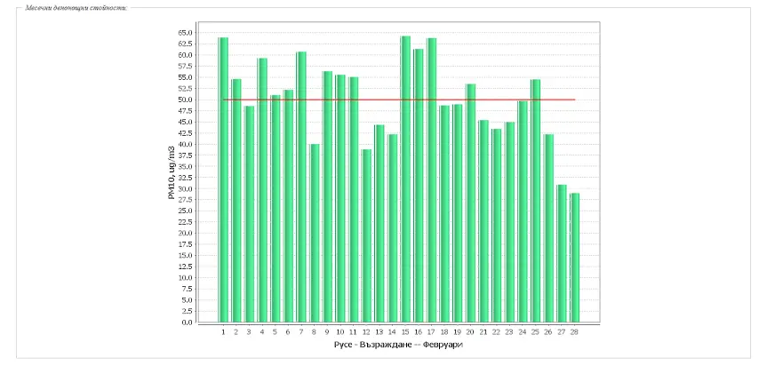 Така от началото на годината до 1 март отчетените дни с превишения вече са 22. Максимално измерената средноденонощна концентрация на този показател е била 69,54 µg/m3, при норма 50 µg/m3. Средномесечната концентрация на този показател за месец февруари през 2022 г. е 50,11 µg/m3. За сравнение през същия период на миналата година са регистрирани почти два пъти по-малко дни с превишения на СДН за ФПЧ10, с максимално отчетена стойност 121,95 µg/m3 и средномесечна концентрация за месец февруари от 48,17 µg/m3.