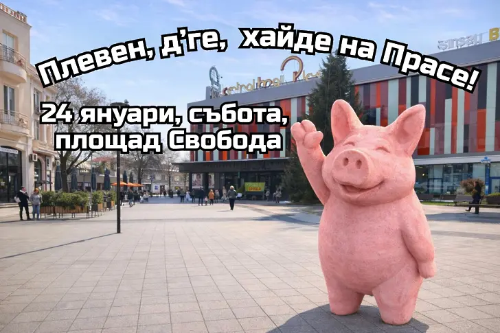 Скулптурата на прасето, която стана символ на най-големите протести в новата ни история напусна жълтите павета и тръгна на турне в страната. Любимецът на народа ще гостува в град Плевен, тази събота на 24.01.2026г. Прасето ще бъде инсталирано на площад „Свобода“ пред Централ Мол Плевен от 10:30 до 19:30 часа.