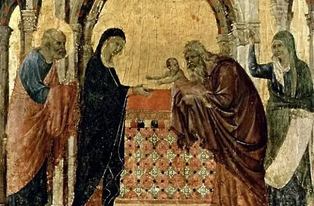 На четиридесетия ден след рождението си Иисус бил занесен в Йерусалимския храм, за да бъде посветен на Бога съгласно Мойсеевия закон. По същото време Светата Божа майка преминала ритуално пречистване и принесла жертва две гургулици, както Законът изисква. Духом просветен, в храма отишъл праведния старец Симеон, който от много столетия очаквал да види Христа - „Утехата Израилева". Нему било обещано, че няма да вкуси смърт, докато не види Спасителя на света.