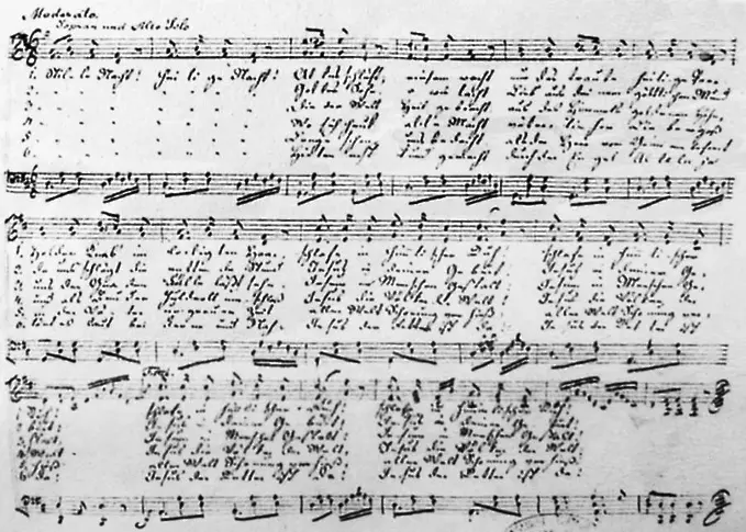Автор на оригиналния текст, написан на немски език, е австрийският свещеник Йозеф Мор, а мелодията е композирана от органиста и учител по музика Франц Грубер.