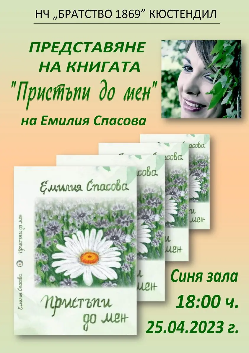 На 25.04.2023 г. от 18:00 ч. в Синята зала на читалище „Братство 1869” ще бъде представена книгата „Пристъпи до мен” на Емилия Спасова. Стихосбирката съдържа 23 поетични творби, които описват реалния живот и изразяват чувствата на авторката към природата и цветята.
