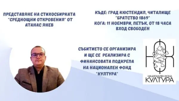 На 11 ноември 2022 г. (петък) от 18:00 часа в Синята зала на читалище „Братство 1869“ ще бъде представена книгата “Среднощни откровения” - третата стихосбирка на младия поет Атанас Янев.